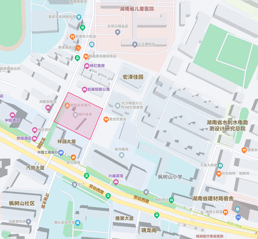 2.銘譽(yù)大廈 項(xiàng)目位于長沙市勞動西路與梓園路交匯處,項(xiàng)目北邊緊臨湖南省兒童醫(yī)院。周邊交通十分便利,距地鐵1號線侯家塘站、芙蓉路僅800米,距五一廣場僅2公里。周邊商業(yè)繁榮,附近有賀龍?bào)w育館、神農(nóng)大酒店、佳程大酒店、中醫(yī)附一、雅禮中學(xué)、楓樹山小學(xué)等。周邊住宅小區(qū)、臨街商業(yè)等數(shù)量眾多,人流量充足,消費(fèi)能力強(qiáng)。