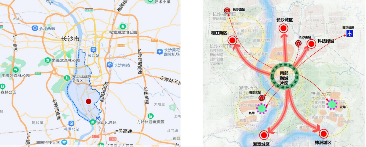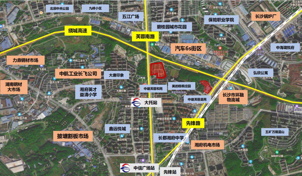 (天心南塘地塊) 三、周邊配套 芙蓉南路地塊: 1.區(qū)位優(yōu)勢(shì):地塊位于天心先鋒街道,屬于南部片區(qū)起步區(qū),為長(zhǎng)株潭融城樞紐單位,具備區(qū)域整體聯(lián)動(dòng)和資源整合的先天優(yōu)勢(shì)。 2.遠(yuǎn)近交通:①地鐵站:靠近1號(hào)線尚雙塘站和7號(hào)線云塘站;②高鐵站:距離長(zhǎng)沙南、湘潭北半小時(shí)左右車(chē)程,距離株洲西站1小時(shí)內(nèi)車(chē)程;③城鐵站:先鋒站僅4分鐘即達(dá),附近還有昭山站和九郎山站;④長(zhǎng)途汽車(chē)站:距離長(zhǎng)沙汽車(chē)南站約12分鐘車(chē)程;⑤飛機(jī)場(chǎng):離長(zhǎng)沙黃花機(jī)場(chǎng)約35分鐘車(chē)程。 3.教育配套。地塊緊鄰卓能奧斯卡、仰天湖小學(xué),長(zhǎng)沙市長(zhǎng)郡湘府中學(xué)、湖南工程職業(yè)技術(shù)學(xué)院等學(xué)校,教育資源豐富。 4.生態(tài)綠化配套。步行十分鐘可達(dá)先鋒公園、紅旗廣場(chǎng)、黑黎社區(qū)公園。 5.購(gòu)物配套。1公里內(nèi)有麥德龍大型超市、500米內(nèi)便利店、菜市場(chǎng)超過(guò)3家。 6.醫(yī)療配套。最近的街道衛(wèi)生服務(wù)中心1.8公里,500米內(nèi)有養(yǎng)天和大藥房。5公里有大托醫(yī)院,皆在“十分鐘醫(yī)療圈”中。