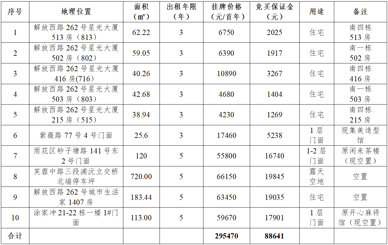 標的位于長沙市解放西路、砂子塘路、湘府西路等42處經(jīng)營性資產(chǎn),本次剩余10處標的進行租賃權(quán)拍賣,現(xiàn)狀為標的6存在原租戶(占用中未搬離),無優(yōu)先承租權(quán),其余均為空置門面招租。